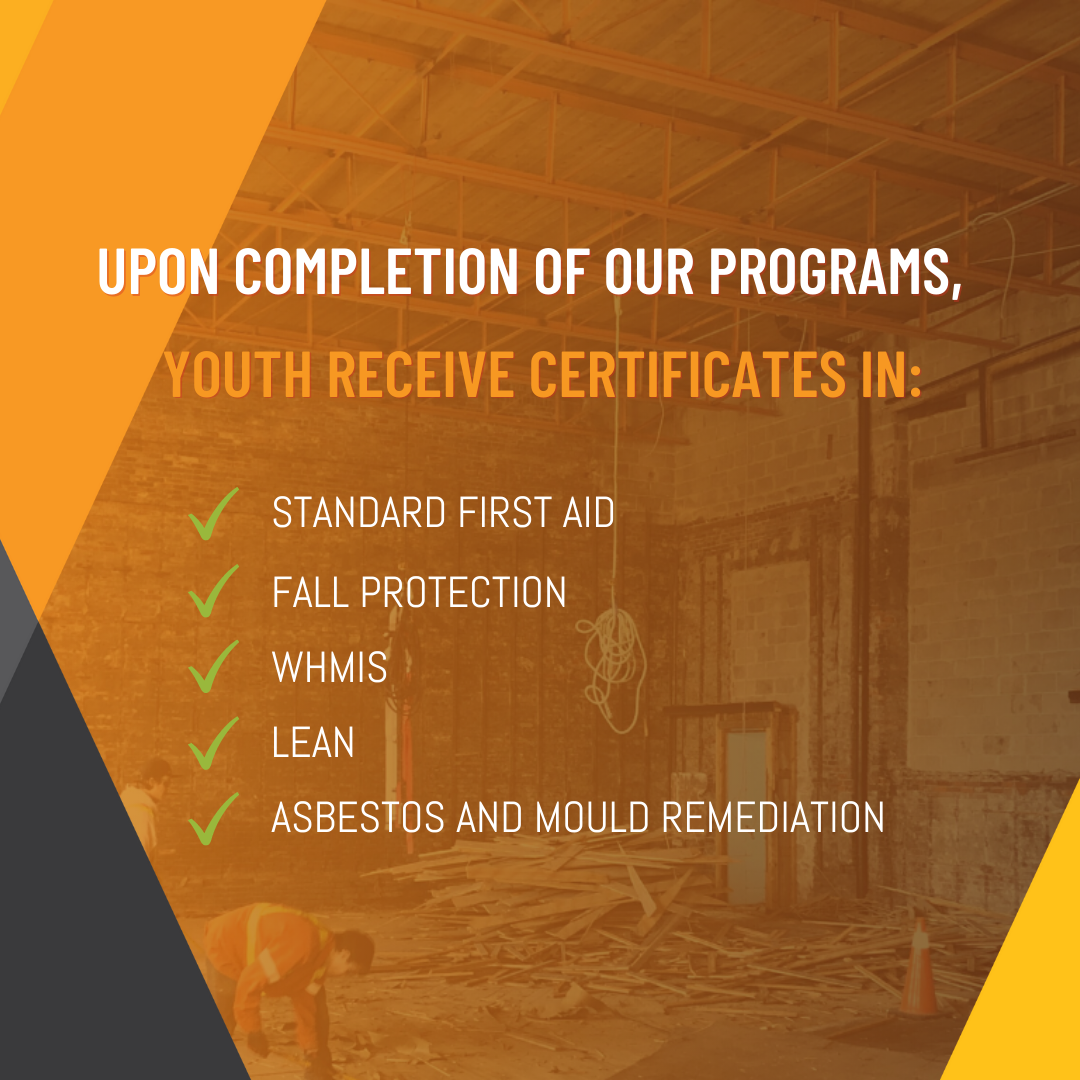 Youth receive in-class and on-the-job training in construction and life skills, and receive certifications in Standard First Aid, Fall Protection, WHMIS, LEAN, and Asbestos and Mould Remediation.